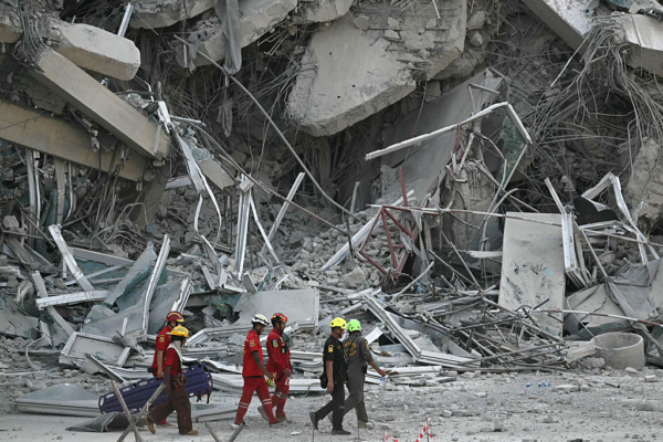 Rescue workers walk past the debris of a construction site after a building collapsed in Bangkok on March 28, 2025, following an earthquake. A powerful earthquake rocked central Myanmar on March 28, buckling roads in capital Naypyidaw, damaging buildings and forcing people to flee into the streets in neighbouring Thailand. (Photo by Lillian SUWANRUMPHA / AFP) (Photo by LILLIAN SUWANRUMPHA/AFP via Getty Images)