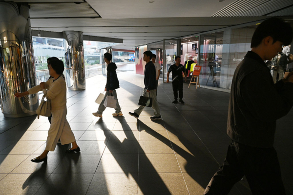 2025年10月7日,為期一週的十一假期期間,人們在北京一家購物中心漫步。(Greg Baker/AFP via Getty Images)