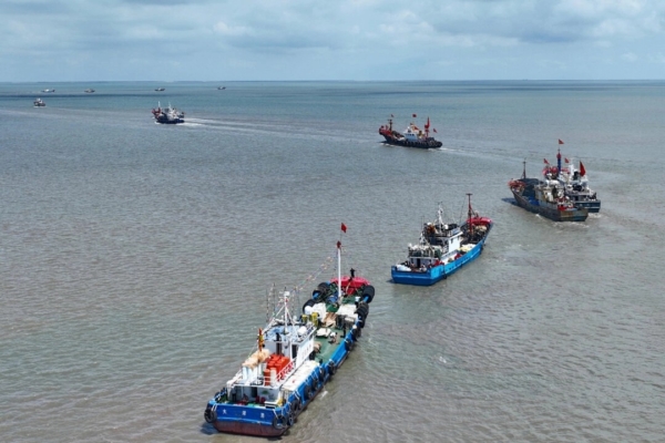 2022年8月1日,江蘇省南通市,黃海和東海漁船在捕魚季的第一天出海捕魚。(STR/AFP via Getty Images)