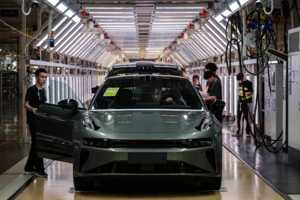 2025年5月29日,浙江省寧波市,工人們在電動汽車製造商寧波極氪(Zeekr)智能科技有限公司的生產線上檢查一輛成品車。(Kevin Frayer/Getty Images)