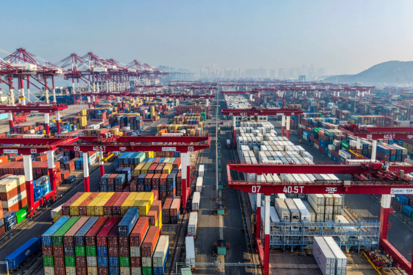 This photo shows an aerial view of containers at the port in Qingdao, in China's eastern Shandong province on December 30, 2025. (Photo by AFP via Getty Images) / China OUT