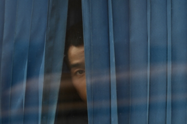 A member of security looks out from a bus at the Great Hall of the People in Beijing on March 3, 2025, ahead of the country's annual legislative meetings known as the "Two Sessions". (Photo by Pedro Pardo / AFP) (Photo by PEDRO PARDO/AFP via Getty Images)