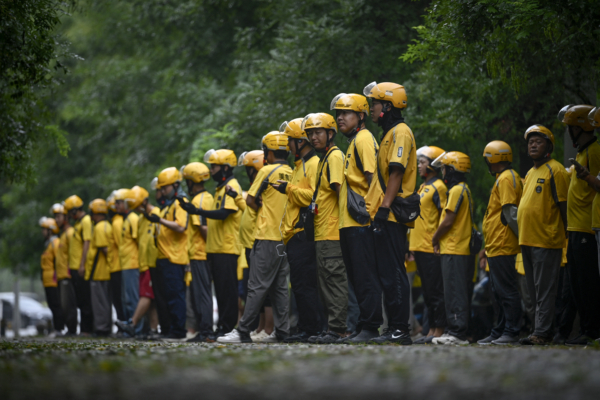 Deliverymen of Chinese shopping platform Meituan gather for a briefing before they start their shift near a mall in Beijing on August 21, 2025. (Photo by WANG Zhao / AFP) (Photo by WANG ZHAO/AFP via Getty Images)
