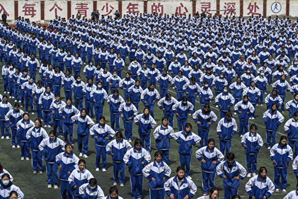 2023年6月18日,西藏的高中學生在課間休息時排隊鍛練。(Kevin Frayer/Getty Images)