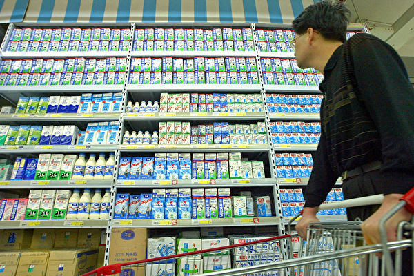 圖為上海一家超市,一名顧客推著購物車走過陳列著奶製品的貨架。(Liu Jin/AFP via Getty Images)