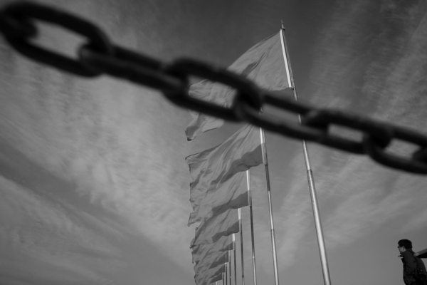 BEIJING - MARCH 09: A photographer stands under the red flags at Beijing's Tiananmen Square during a plenary session of the annual National People's Congress (NPC) in the adjacent Great Hall of the People on March 9, 2009 in Beijing, China. Chinese Premier Wen Jiabao has announced a set of plans and polices by the Chinese government to cope with the tough economic situation and stimulate the Chinese economy. (Photo by Feng Li/Getty Images)