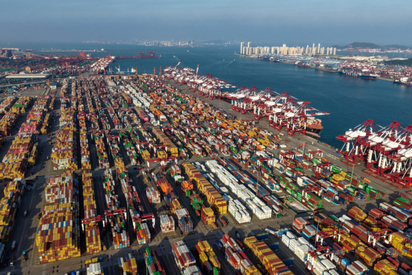 Containers and ships are seen at the container terminal of the port in Qingdao, in China's eastern Shandong province on September 10, 2025. (Photo by AFP) (Photo by -/AFP via Getty Images)