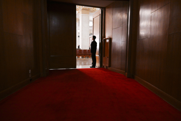 示意圖。北京大會堂裡,一名安全官員在入口處站崗。(JADE GAO/AFP via Getty Images)