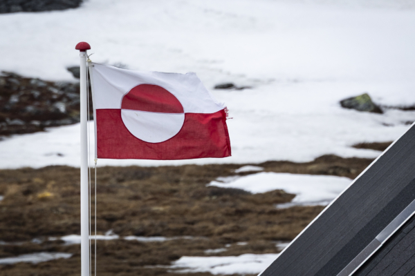 2025年5月4日,格陵蘭的國旗在格陵蘭努克(Nuuk)外飄揚。(John Fredricks/T英文大紀元)