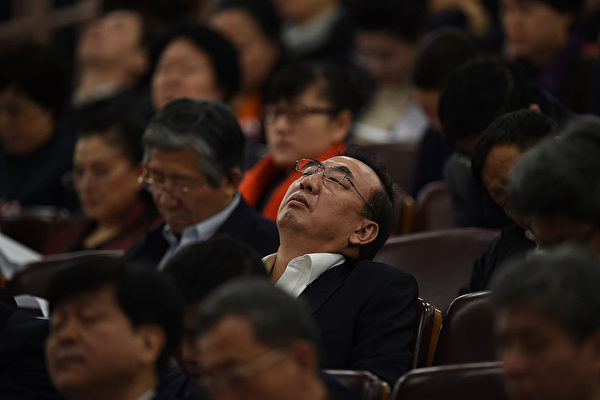 不少評論認為,中共是體制性腐敗,造成越反越腐。圖為2016年3月13日,中共兩會上的代表在睡大覺。(Greg Baker/AFP via Getty Images)