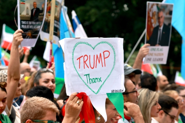 Members of the Iranian community hold placards, wave flags and chant slogans during a rally in Sydney on March 1, 2026. Australia's Prime Minister Anthony Albanese said on March 1 that Iran's supreme leader Ayatollah Ali Khamenei "will not be mourned", as state media in the Islamic republic confirmed he had been killed. (Photo by DAVID GRAY / AFP via Getty Images)