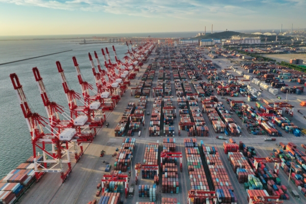 圖為2023年8月10日,中國遼寧省營口港的起重機和貨櫃。(STR/AFP via Getty Images)