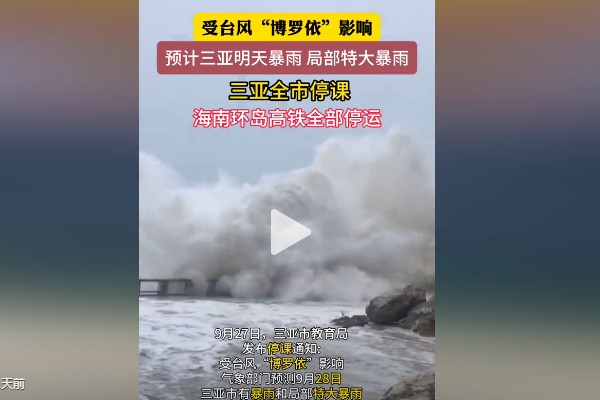 【2025年09月28日訊】(張鐘元報導)據「三亞發布」微信公眾號消息,受今年20號颱風「博羅依」影響,三亞將出現大風、暴雨等惡劣天氣,中心附近最大風力12級(35米/秒)。三亞市已於27日21時啟動防汛防風Ⅱ級應急響應,並發布停課、停工、停運、停航,及景區景點關停「四停一關」通知。