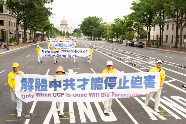 在法輪功反迫害26周年之際,2025年7月17日,來自美國東部地區的部分法輪功學員與支持者在華盛頓DC舉行盛大遊行,呼籲「解體中共,停止迫害法輪功」。(戴兵/大紀元)