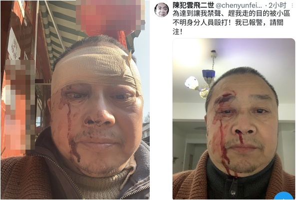 2026年1月8日上午9時許,中國著名人權捍衛者陳雲飛,在小區內遭到不明身分男子毆打,面部多處受傷。(網絡圖片)