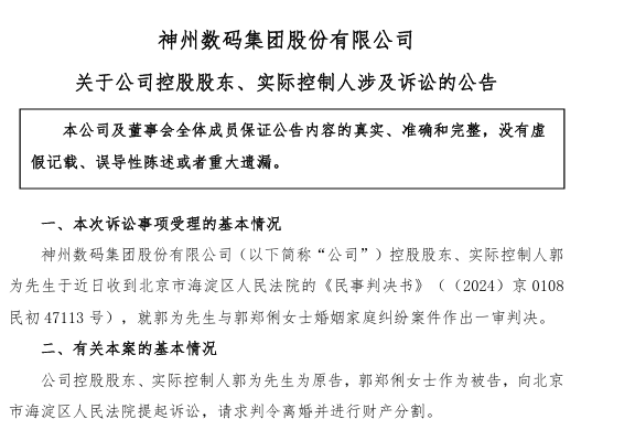 神州數碼11日連續發布兩份有關公司控股股東、實際控制人涉及訴訟的公告。公告表示公司控股股東、實際控制人郭為和妻子郭鄭俐被北京海淀區法院判決離婚。對於財產分割事宜,北京市海淀區法院將繼續審理,再行裁判。