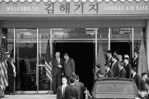 2025年10月30日,美國總統川普與中共黨魁習近平在韓國釜山金海空軍基地舉行雙邊會談後離場。(Andrew Harnik/Getty Images)