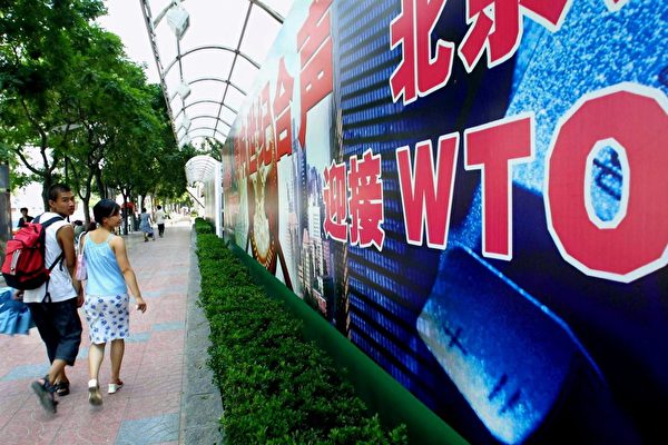 2001年7月17日,在北京的一條街道上,一個宣傳中國加入世界貿易組織(WTO)的廣告牌。(Goh Chai Hin/AFP/Getty Images)
