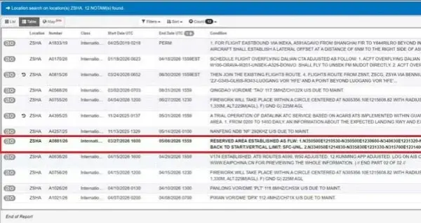 過去,中共軍隊的軍事演習禁航通常僅持續數天,但此次長達40天的跨度完全打破慣例。更特殊的是,該禁區的高度限制為「SFC-UNL」(地面至無上限),這意味著所有空中活動,甚至包括太空軌道的運行都將受影響。