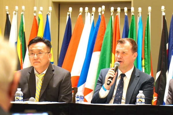 2025年10月3日,國際扶輪社在華盛頓DC的威斯汀酒店放映獲獎紀錄片《國有器官》。圖為「反強摘器官醫生組織」(DAFOH)歐洲部副主任安德烈亞斯‧韋伯醫生(Andreas Weber)(右)和法輪大法信息中心副主任劉寧平(Larry Liu)(左)在現場和觀眾互動環節中。(張奕/大紀元)