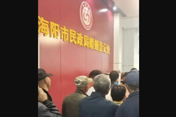 網上流傳的視頻顯示,一個大廳裡,牆壁上掛著「海陽市民政局婚姻登記處」牌子,幾名工作人員在現場忙碌,周圍圍著眾多的老人。