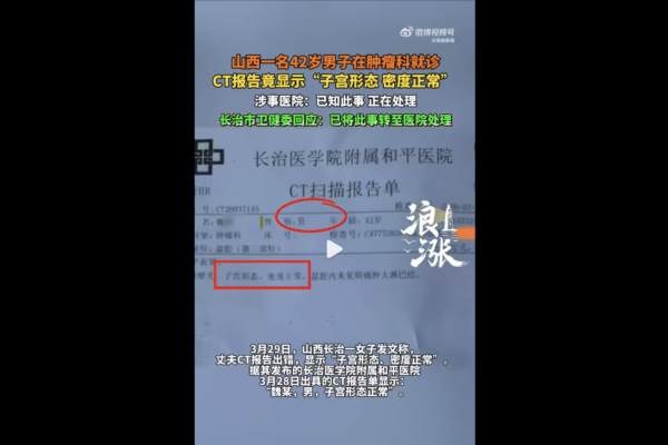【2026年03月31日訊】山西長治醫學院附屬和平醫院近日發生一起CT報告單將男性患者誤診為「子宮形態正常」的醫療差錯,事件引發社會關注。