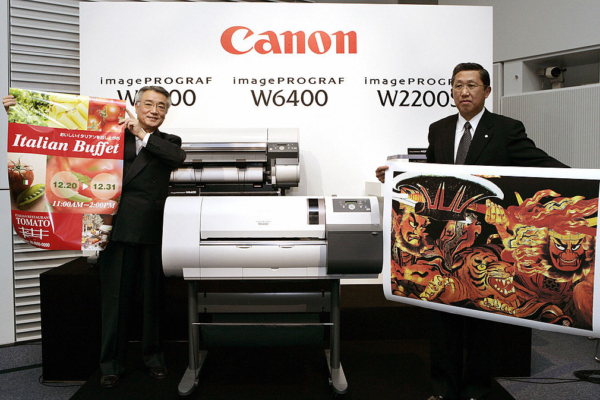 TOKYO, JAPAN: Fumitaka Yamada of President of Canon Sales' professional products company (L) and Toshio Honma, an executive of Canon Inc., show off print-out samples of new Canon image PROGRAF large-format inkjet printer series, B0+ W8400 (L), A1+ W6400 (C) and W2200S (L) during their press preview in its Tokyo headquarters, 24 January 2005. Canon introduces three new large-format inkjet color graphic printers, catering to board needs, from graphic arts to CAD, onto the worldwide market from March this year. The price of W8400 will be 598,000 yen (about 5,863 USD), almost a half price from its previous model, W6400 298,000 yen (about 2,922 USD) and W2200S 248,000 yen (2,432 USD). AFP PHOTO/TOSHIFUMI KITAMURA (Photo credit should read TOSHIFUMI KITAMURA/AFP via Getty Images)