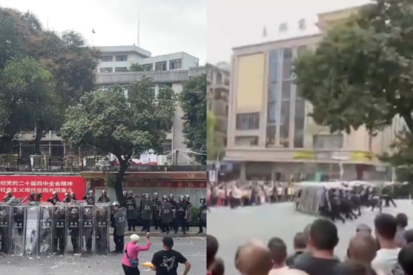 現場視頻顯示,大批手持盾牌、警棍的防暴警察在市政府門口列陣,與村民對峙。一名滿頭白髮的老人走到人群前面,多次拿起雞蛋和石塊投向防暴警察。