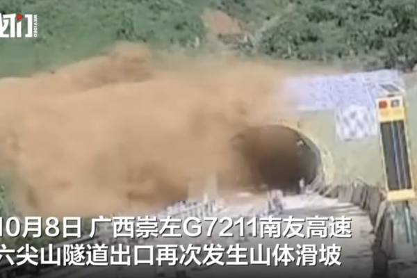 【2025年10月09日訊】(記者方曉報導)近日,廣西崇左G7211南友高速六尖山隧道段,兩次突發山體滑坡。山體滑坡發生在隧道憑祥至南寧方向入口處,泥沙傾瀉而下,堵住隧道口。滑坡發生前,有車輛剛剛進入隧道,隧道口還有一名人員,滑坡導致雙向車道阻斷。南友高速是大陸的一條重要交通動脈。