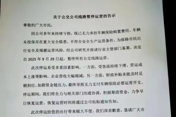 大陸多地公交公司因經營困難而陷入倒閉危機。近期,廣西荔浦通達城鄉公共客運有限公司等三家公交公司聯合發出通告,表示運營資金長期不足。一方面,客流下滑、營運成本上漲,導致營收銳減;另一方面,財政補貼未能及時足額到位,加劇資金鏈緊張,最終使企業無力支付車輛保險等必要開支。自29日起,公交將暫停運營。