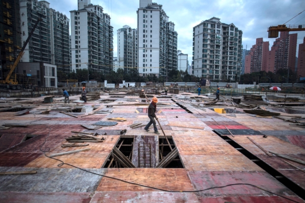 TOPSHOT - A man works at a construction site of a residential skyscraper in Shanghai on November 29, 2016. Chinese household debt has risen at an "alarming" pace as property values have soared, analysts say, raising the risk that a real estate downturn could send shockwaves through the world's second largest economy. (Photo by Johannes EISELE / AFP) (Photo by JOHANNES EISELE/AFP via Getty Images)