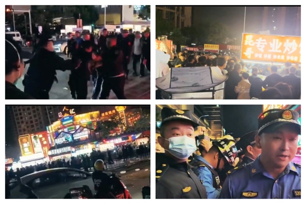 然而,當晚9點左右,大批城管人員集結到夜市,試圖驅逐攤販,雙方隨即爆發衝突。