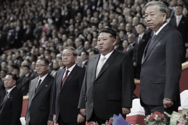 在俄羅斯國家通訊社Sputnik發布的這張集體照片中,朝鮮領導人金正恩(右二)、越南共產黨總書記蘇林(右)和中共總理李強(右三)於2025年10月9日出席在平壤舉行的朝鮮勞動黨建黨80周年紀念活動。(Yekaterina Shtukina/POOL/AFP via Getty Images)