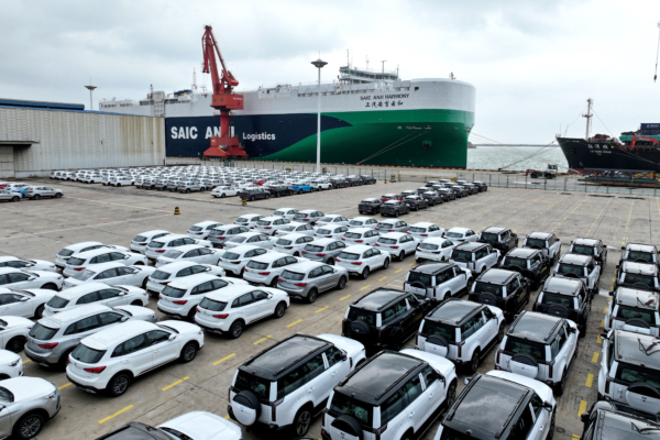 圖為2025年8月10日,中國製造的汽車停放在江蘇省連雲港港口的碼頭上。(STR/AFP via Getty Images)