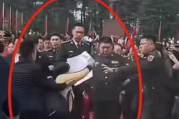 前中共黨魁毛澤東之孫毛新宇日前回湖南祭祖,一名女子手舉多張紙衝到毛新宇面前,疑似是訪民訴冤,身著軍裝的隨從急忙將女子拖走。(視頻截圖)