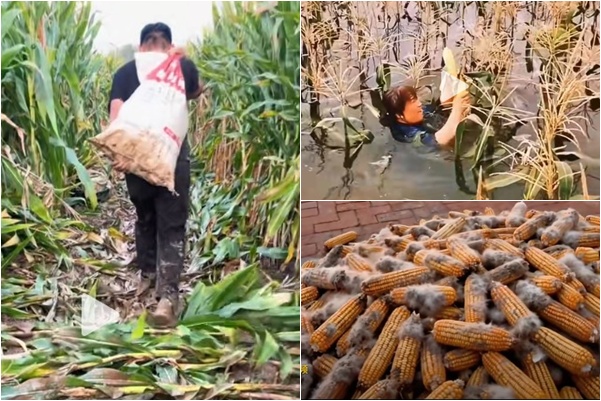他對說,地裡積水達膝蓋深,行走困難。全家九口人赤著腳,用小桶、袋子一點點往外運。忙活了一天,才收了三四百斤,其中還有不少玉米已發霉腐爛了。