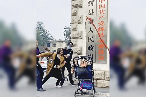 河南疫苗維權人士何方美,因替疫苗致殘女兒維權,被判刑五年六個月。圖為2020年10月她在河南省輝縣政府門前潑漆被抓。(視頻截圖)