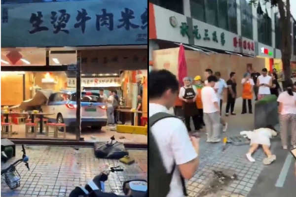 網傳視頻顯示,一輛出租車衝進路邊一家餐廳內,在車輪前方有一個人躺在地上,店門口兩輛摩托車被撞倒在地,不遠處的路邊還有一位女子趴在地上一動不動。店鋪的門匾上寫著「生燙牛肉米綫」。