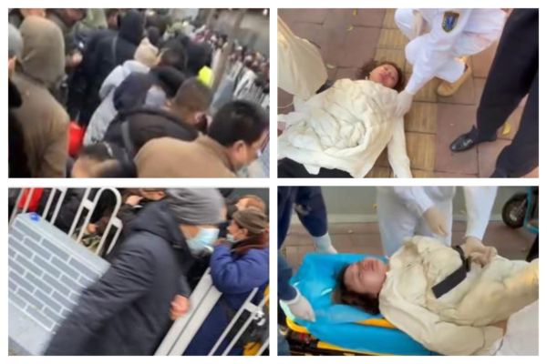 中共兩會維穩,福建廈門訪民張尼君(右圖上、下)和王秀英在北京國家信訪局(左圖上、下)被地方維穩人員控制。(受訪者提供/大紀元合成)