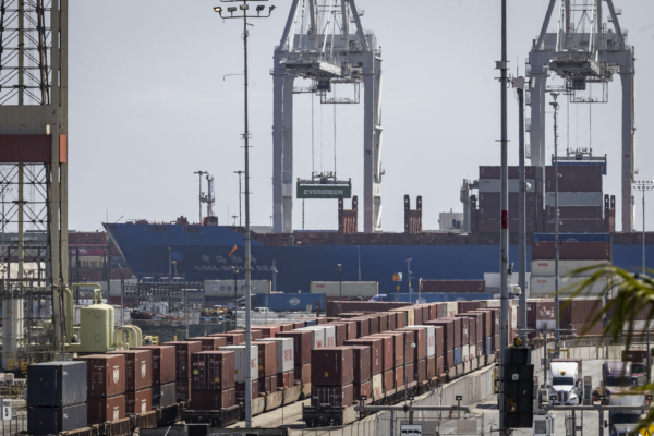 Shipping containers line the Port of Long Beach, Calif.,on March 28, 2025. (John Fredricks/The Epoch Times)