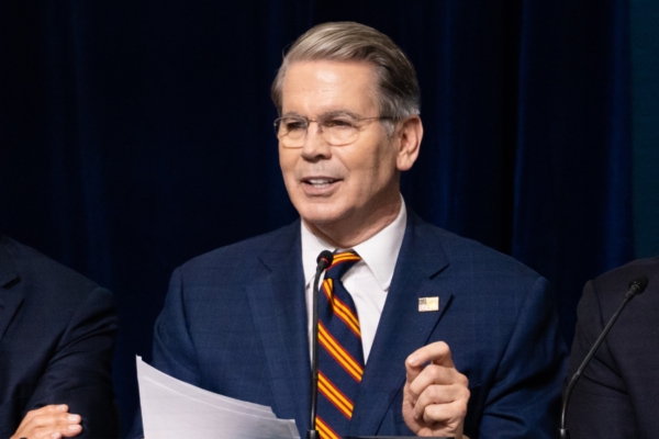 圖為貝森特於2025年7月15日在匹茲堡舉行的賓州能源與創新峰會上。(Samira Bouaou/大紀元)