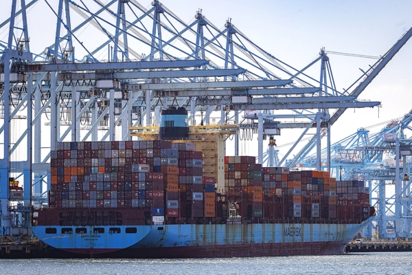 2025年3月28日,停靠在美國洛杉磯港口的貨櫃船。(John Fredricks/英文大紀元)
