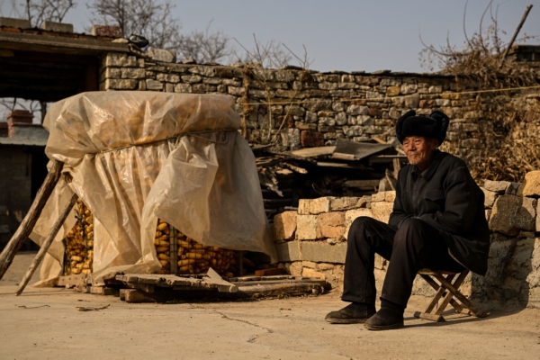 圖為2023年1月7日,山東省泰安市農村地區的一位老人坐在玉米垛旁邊。(NOEL CELIS/AFP via Getty Images)