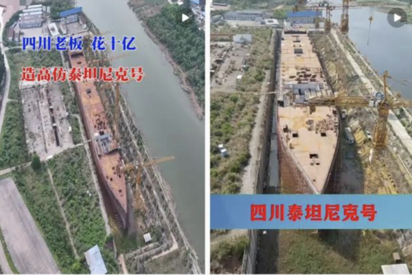 據網上流傳的一段航拍視頻,四川省大英縣郪江岸邊地船塢內一艘山寨版「泰坦尼克號」初具雛形,但鏽跡斑斑。建設現場空無一人,一片荒涼,船隻模型及周圍的腳手架、吊車全部生鏽。