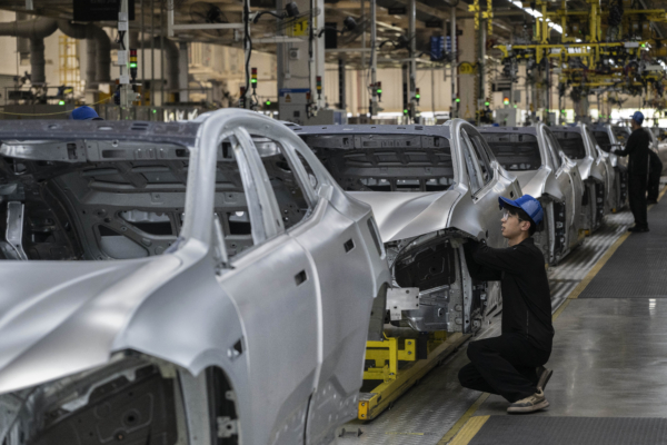 NINGBO, CHINA - MAY 29: A worker checks the frame of a car on the production line for electric vehicle maker Zeekr at its factory on May 29, 2025 in Ningbo, China. China's automakers account for nearly two-thirds of global sales of electric vehicles and exports more vehicles overseas than any other country. Zeekr, a pure-electric brand aimed at the luxury market, has seen sales growth in the highly competitive Chinese market and is furthering its expansion into Asia, the Middle East, Latin America, and parts of Europe. The company's plans to enter the US market has faced hurdles due to tariffs on China made electric vehicles. In 2024, Zeekr delivered more than 220,000 vehicles, according to the company. Zeekr is among several Chinese EV makers building vehicles in automated factories using robotics powered by artificial intelligence alongside human workers. Zeekr is owned by Geely Holdings, which also has ownership stake in a number of foreign brands including Volvo, Lotus, and Polestar. (Photo by Kevin Frayer/Getty Images)