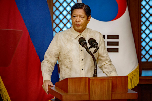 圖為2024年10月7日,菲律賓總統小馬科斯(Ferdinand Marcos)在馬尼拉南宮與韓國總統尹錫悅會面時發表演講。(Ezra Acayan/POOL/AFP via Getty Images)