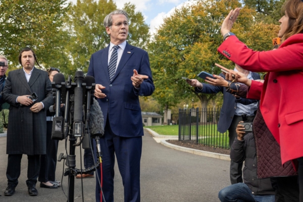 圖為2025年10月22日,美國財政部長斯科特‧貝森特在白宮西翼外與記者交談。(Jim Watson/AFP)
