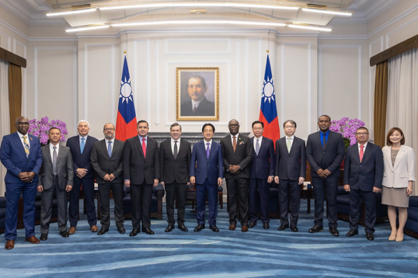 2025年9月27日,中華民國總統賴清德接見「拉丁美洲暨加勒比海情報暨安全首長聯席會議訪團」並合影。(中華民國總統府提供)