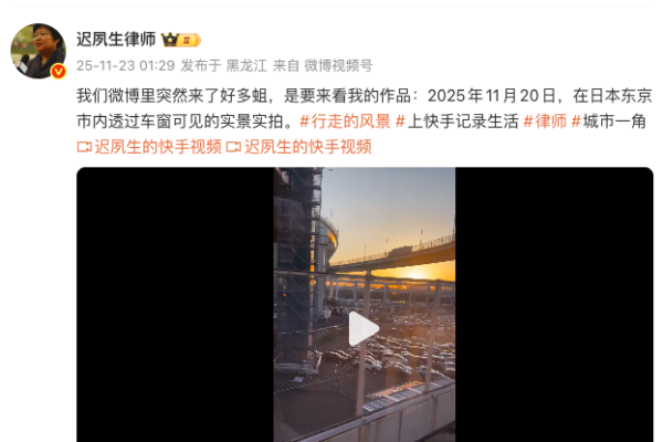 今年69歲的知名律師遲夙生在微博發布了一段實景拍攝東京的視頻,並說,「我們微博裡突然來了好多蛆,是要來看我的作品:2025年11月20日,在日本東京市內透過車窗可見的實景實拍。」