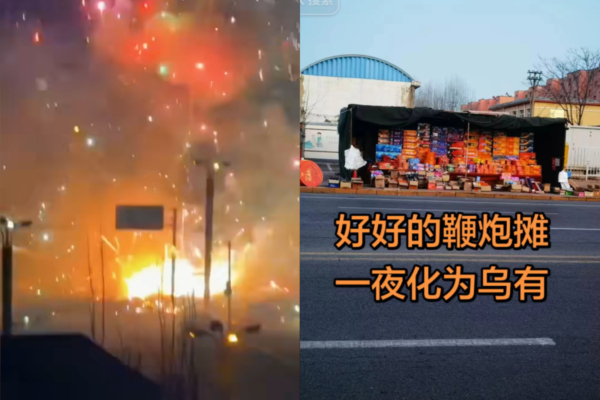 【2026年02月14日訊】中國新年前,遼寧盤錦市長湖新城的一處販售鞭炮、煙花的路邊攤失火爆炸,一夜化爲烏有。